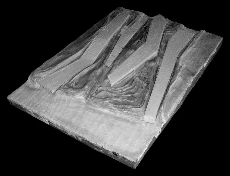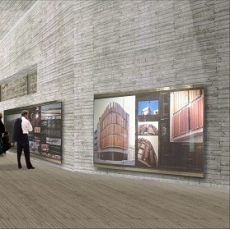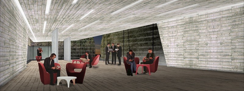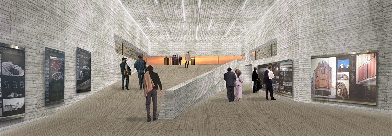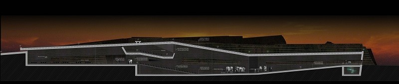 Decidimos ir a las oficinas, llegamos al paso central y desde allí podemos controlar toda la gente que pasa. Ahora bajamos por las escaleras para dirigirnos a la zona de exposiciones. Empezamos a andar bajando por la rampa. Parece que nos estemos adentrando dentro del terreno. La altura de los paramentos verticales es considerable. Se trata de un pasillo angosto. Los altos muros se nos echan encima y entonces,…, se nos abre un gran espacio. Una zona mucho más oxigenada e iluminada. Dos rampas se cruzan. La más grande sube y se va ensanchando dando una sensación de sosiego y tranquilidad. Se trata de un espacio muy abierto. En cambio, si decidimos bajar todavía más, el espacio se va estrechando más, aumentando la sensación de desasosiego. Finalmente, recorremos el último tramo de la sala de exposiciones, al final vemos una estrecha luz y salimos por esa pequeña abertura.