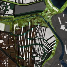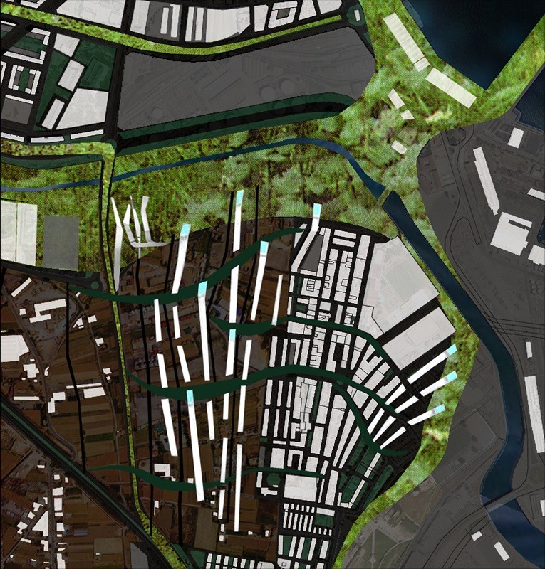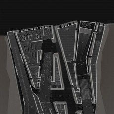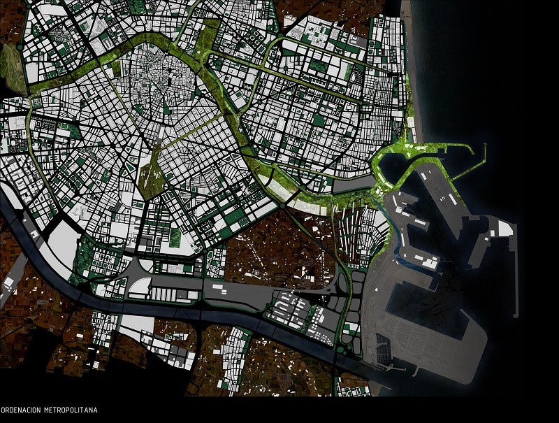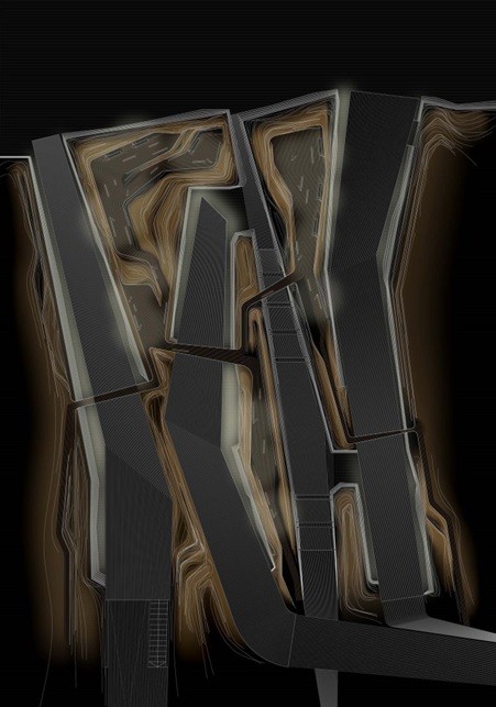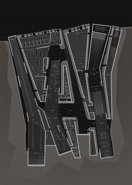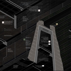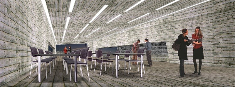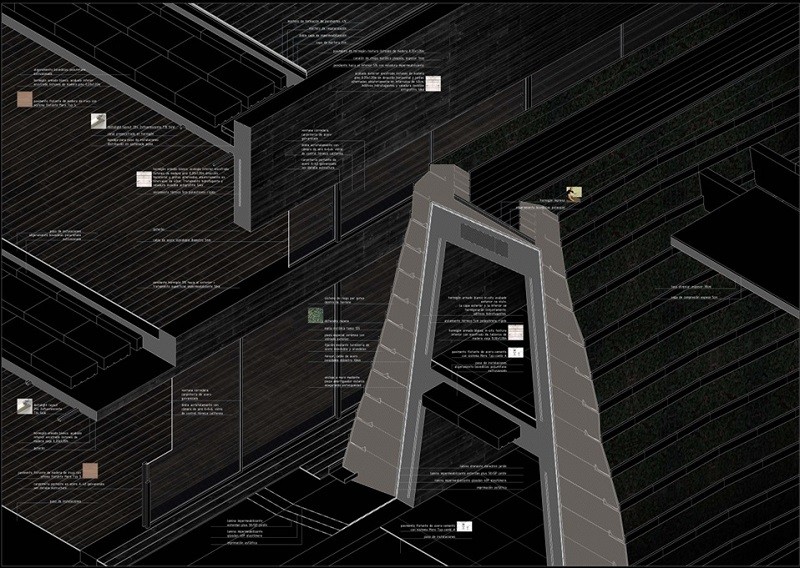 Bajamos por la rampa de acceso, y al fondo, entre los muros de tierra que conforme avanzamos cada vez se van tirando más sobre nosotros, vemos el cauce. La luz cae linealmente desde las aperturas en la cubierta. Luz-sombra-luz-sombra-… Al comenzar a bajar veíamos a la gente trabajando arriba, en el puente. Pero ahora estamos bajo él, conforme avanzábamos y nos adentrábamos en el edificio, paradójicamente íbamos perdiendo de vista lo que sucede en el interior, lo que nos hace aumentar la curiosidad. Bajo las oficinas, entramos entre dos muros de tierra al recinto. Pero antes de entrar, un rayo de luz ilumina la entrada. Entramos y a la izquierda vemos la biblioteca. Giramos la vista atraídos por la luz y vemos un amplio espacio con gente trabajando con sus portátiles y tomando café o comiendo unas patatas bravas. Como un cañón, el hormigón pasa por encima de nuestras cabezas entre el terreno. Esa gran caja de hormigón parece flotar a pesar del sentido de gravidez que nos da dicho material. Entramos en los archivos y de pronto se nos abre el espacio. Pero no se trata de una doble altura simplemente, pues el suelo empieza a ascender para conducirnos al exterior. Si entrásemos desde fuera, veríamos como el suelo entra y pasa poco a poco por debajo del hormigón. Como si un plano esquivase al otro, deslizándose entre ellos. Subimos a la biblioteca y nos encontramos dentro del cañón de hormigón blanco y al fondo el paisaje enmarcado en una panorámica. Conforme nos queremos acercar al fondo, el techo va bajando en altura, y cuando nos sentimos comprimidos, de pronto, se nos abre todo el paisaje. A los laterales vemos como la luz resbala por los paramentos vegetales.