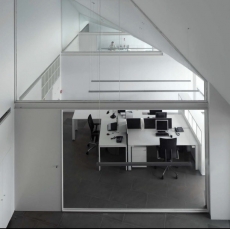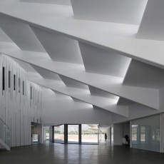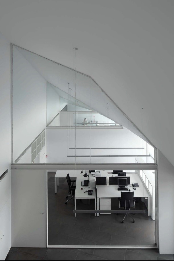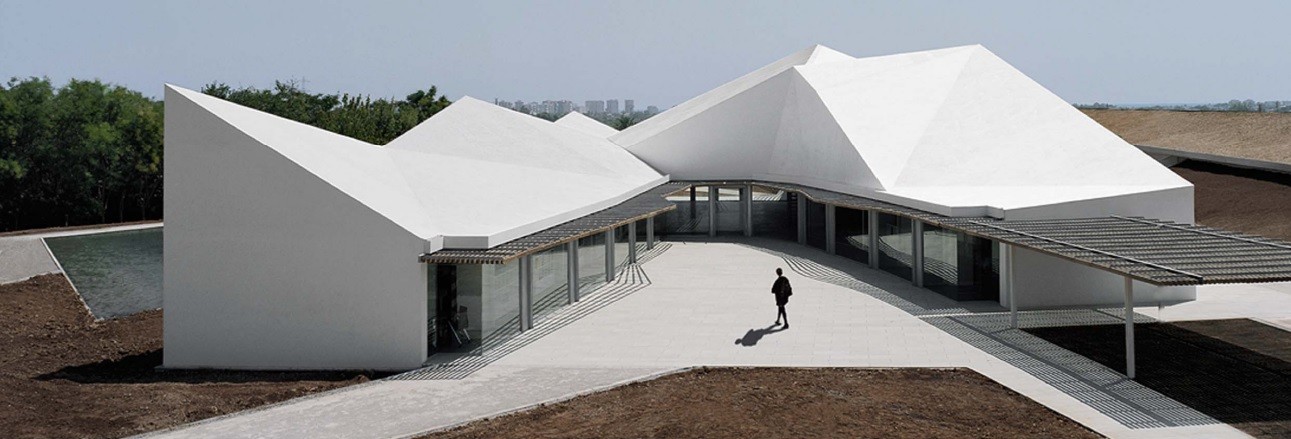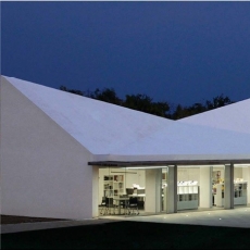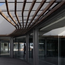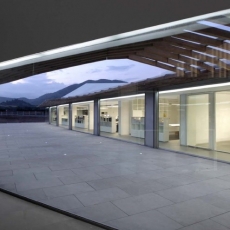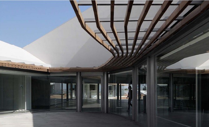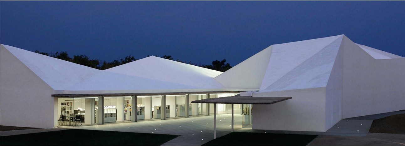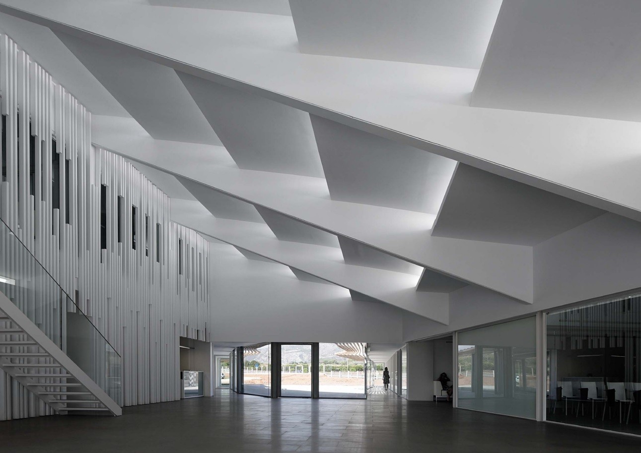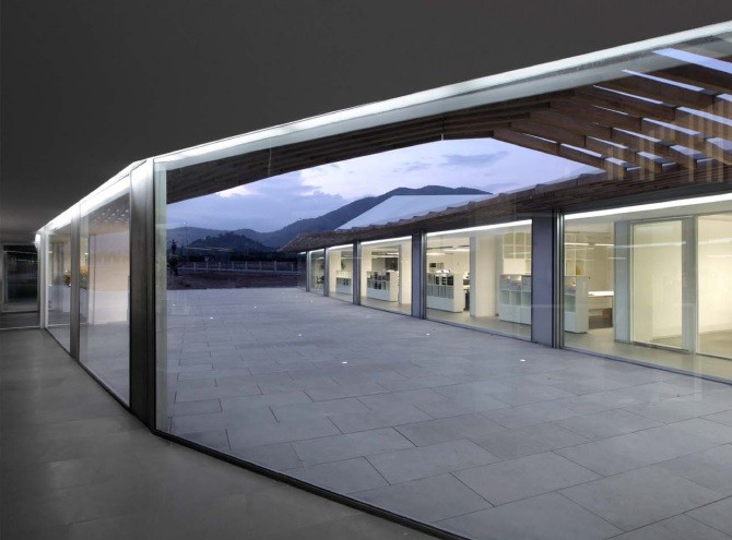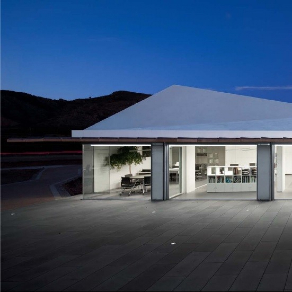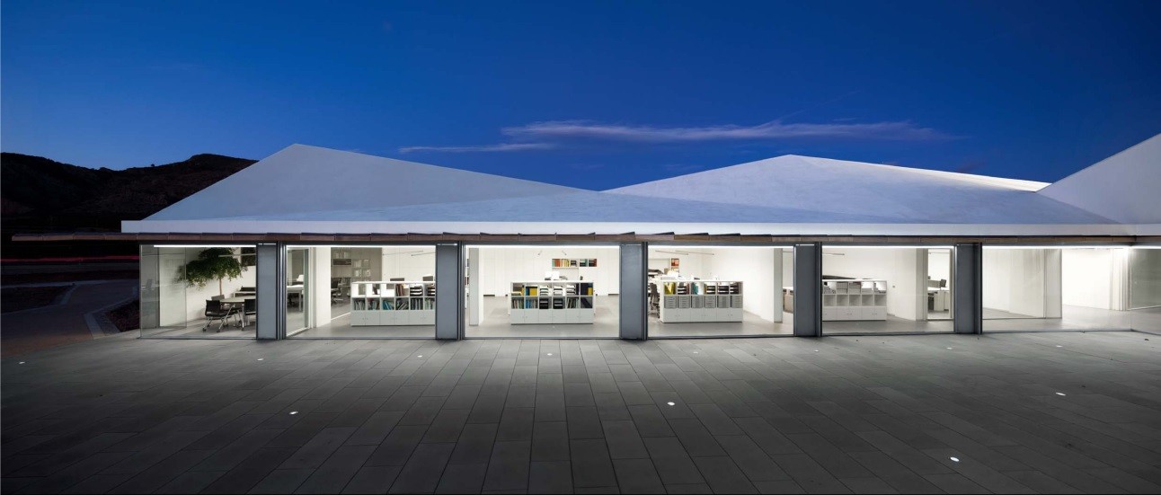 El edificio sede administrativo se estructura en dos alas unidas por un cuerpo central en torno a dos patios abiertos cerrándose al paisaje lejano y estableciendo su propio clima y relación interior/exterior.
