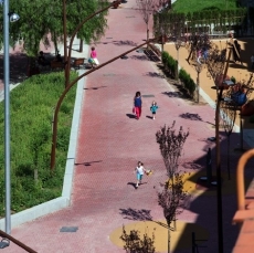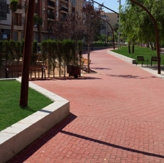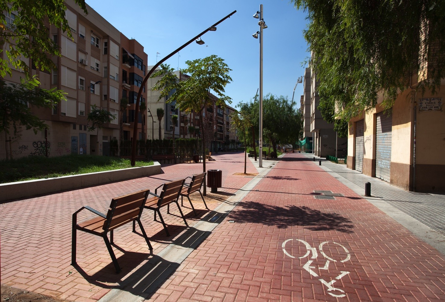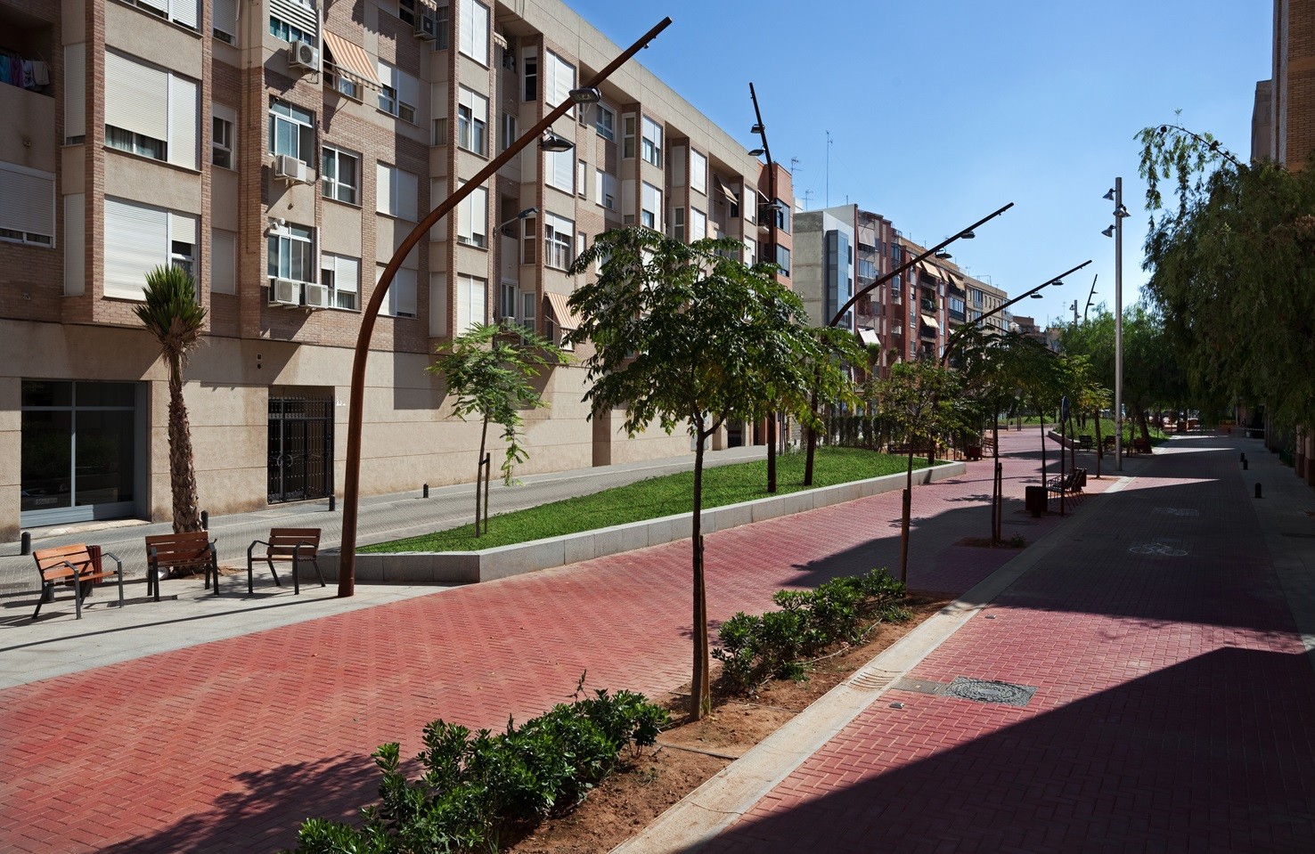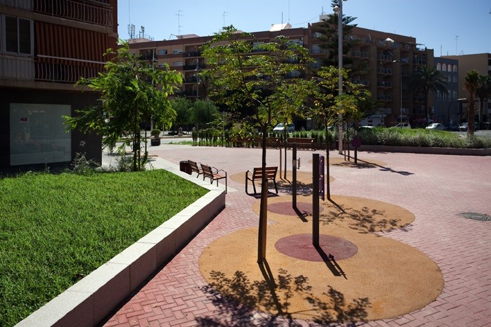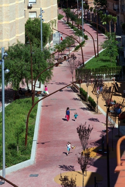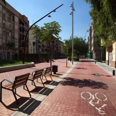 La proposta presenta una geometria formada per línies trencades amb l’objectiu que el recorregut longitudinal compti amb espais ajacents destinats a diferents usos, zones de descans i trobada dels veïns. S’ha rodejat el recorregut central de jardinesres elevades envoltades per una peça de granit que funciona també de banc, aquest material s’utilitza també en els elements d’encintat com canals i rigoles.