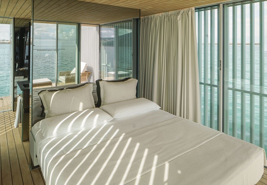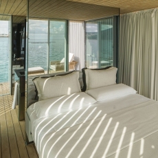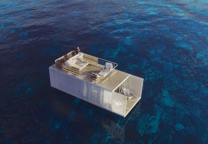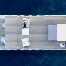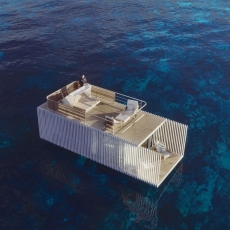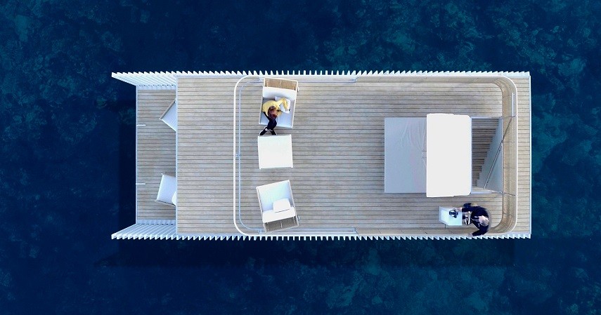 La cubierta de la unidad flotante se proyecta a modo de terraza chill-out, como espacio diáfano con una cama doble con capota en el punto central.