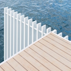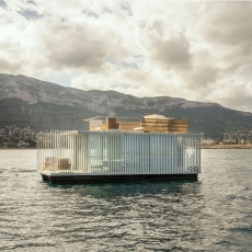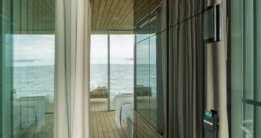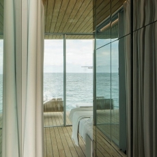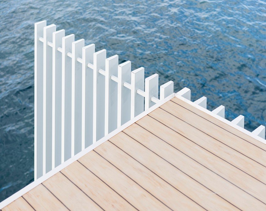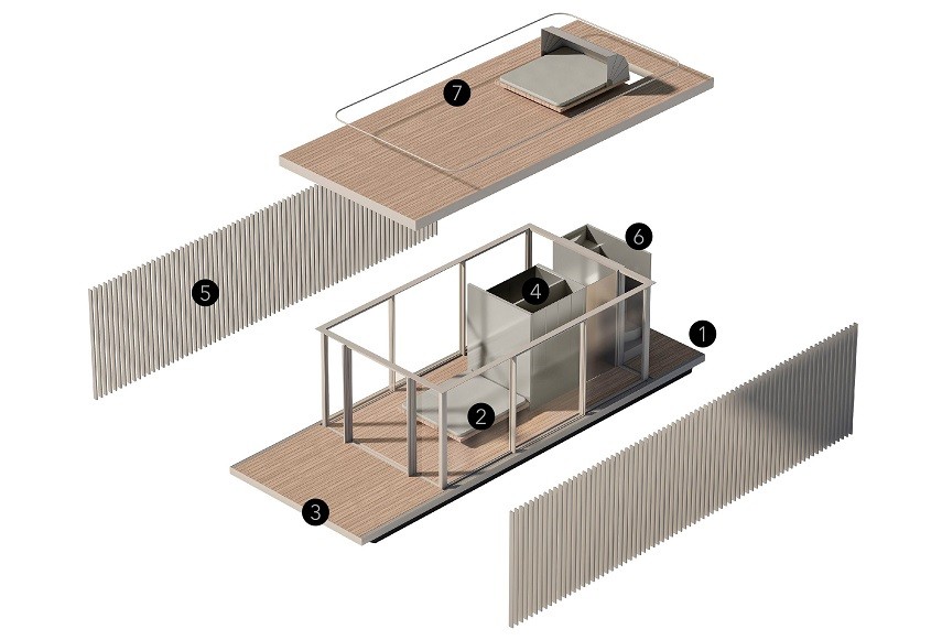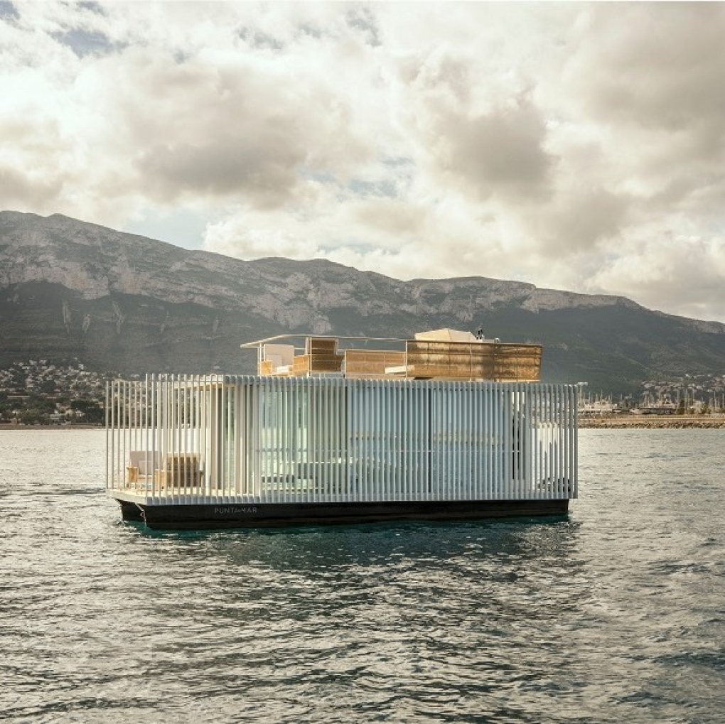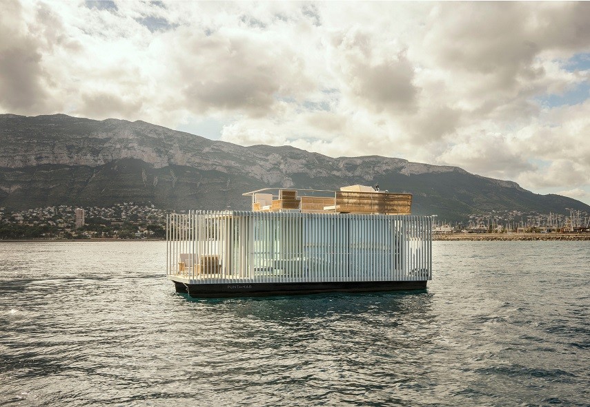 El prisma se presenta como un elemento aparentemente cerrado por dos de sus laterales con un sistema de lamas fijas que nos protegen del sol y nos transmiten al interior las vibraciones de la luz del sol, por el transcurrir del día y por el movimiento de la unidad flotante sobre el agua, lo que aporta dinamismo al espacio interior. Los otros dos laterales presentan el acceso en la terraza de popa y la terraza privada en proa, esta última totalmente abierta al exterior.