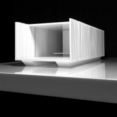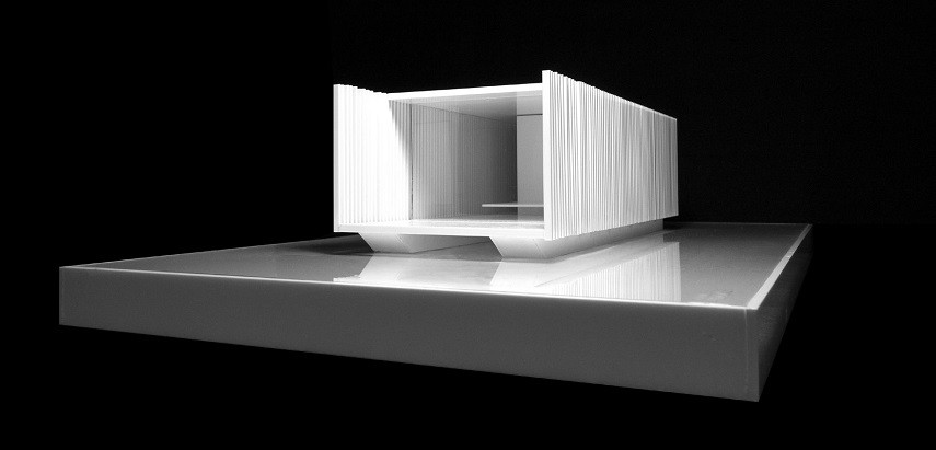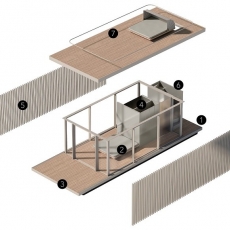 con el medio. Existe un núcleo central que alberga los usos de baño y almacenaje, este núcleo esta revestido de vidrio con un tratamiento que matiza la reflexión y que nos la muestra sutilmente reflejándose el entorno en el crenado una experiencia perceptiva de 360º.