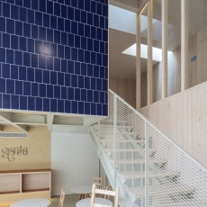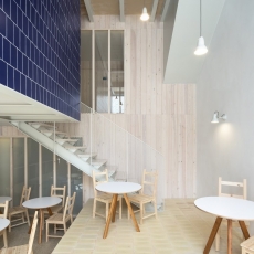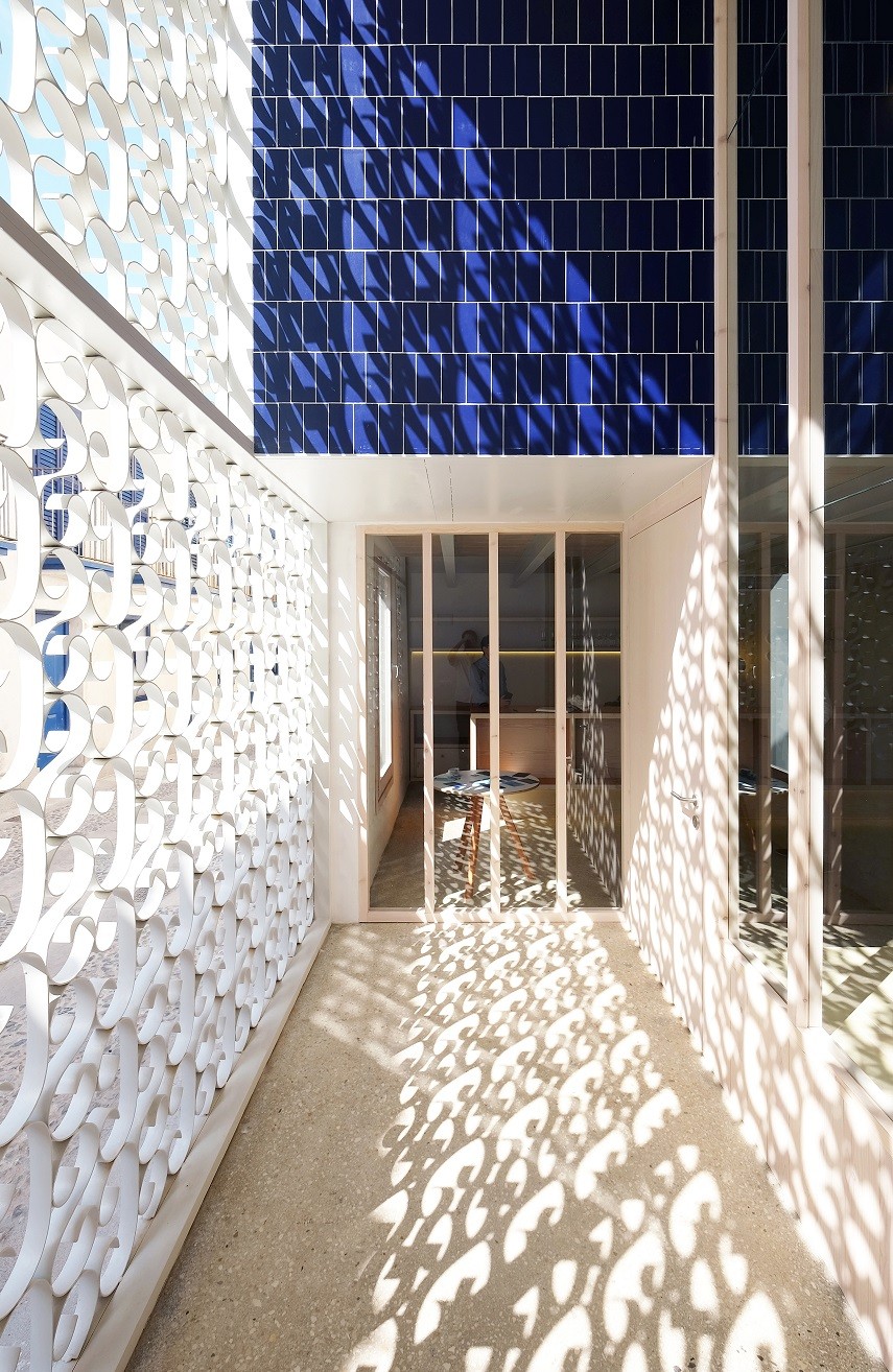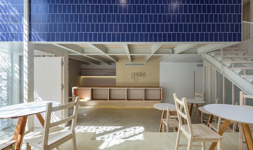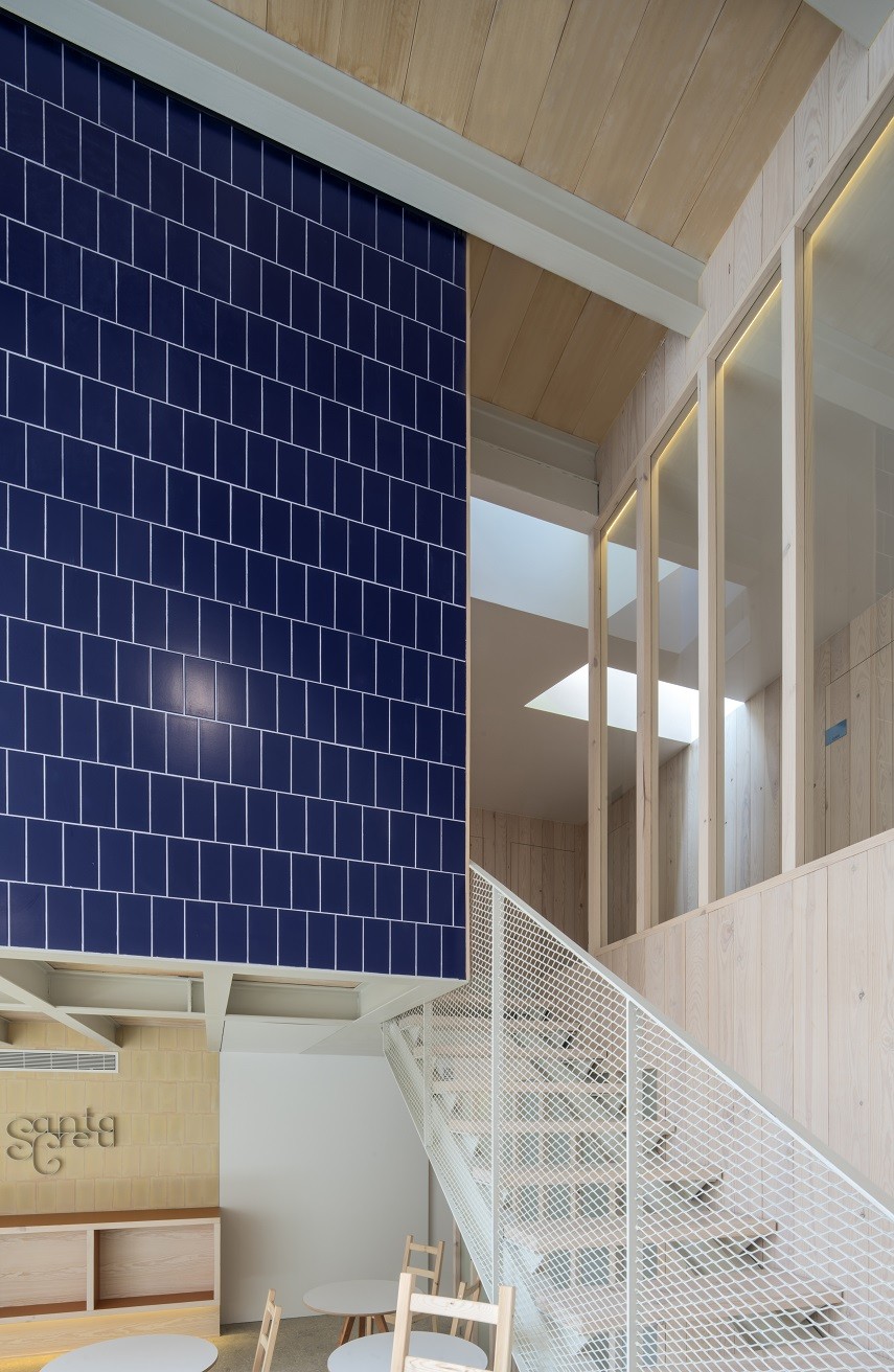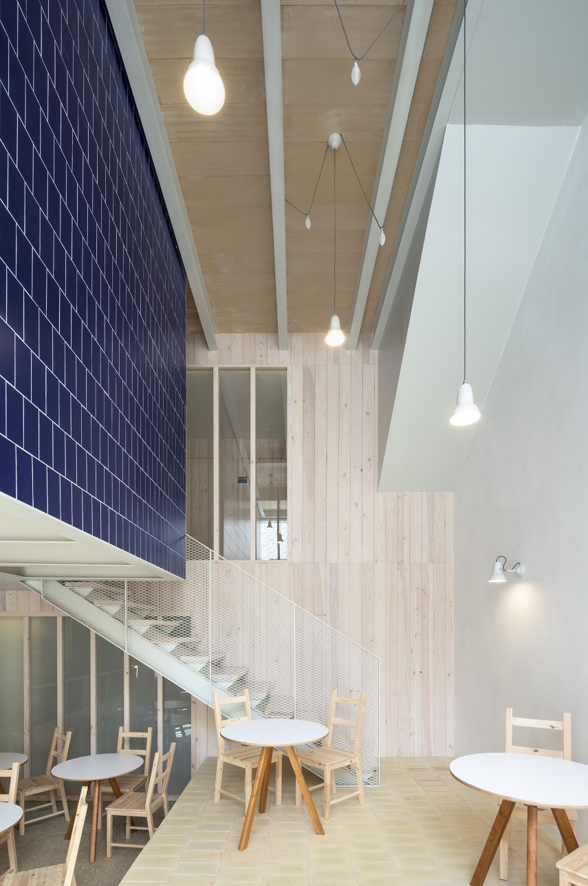 Son tres los elementos básicos en los se han aplicado estos materiales cerámicos: los bardos han sido utilizados como elementos estructurales a modo de bovedillas vistas en los forjados, como complemento a la estructura de acero con vigas y viguetas también vistas; la toba cerámica se ha empleado como alternativa a la teja plana en cubierta, debido a esa versatilidad para ser colocada tanto en elementos verticales como horizontales, apareciendo también en el paramento de la recepción y como pavimento en el espacio común a doble altura de la planta baja; el azulejo, para terminar, ha servido para conseguir una solución abierta de baño en las habitaciones, tanto en suelos como en paredes e incluso formando singulares piletas cerámicas como lavabos.