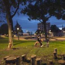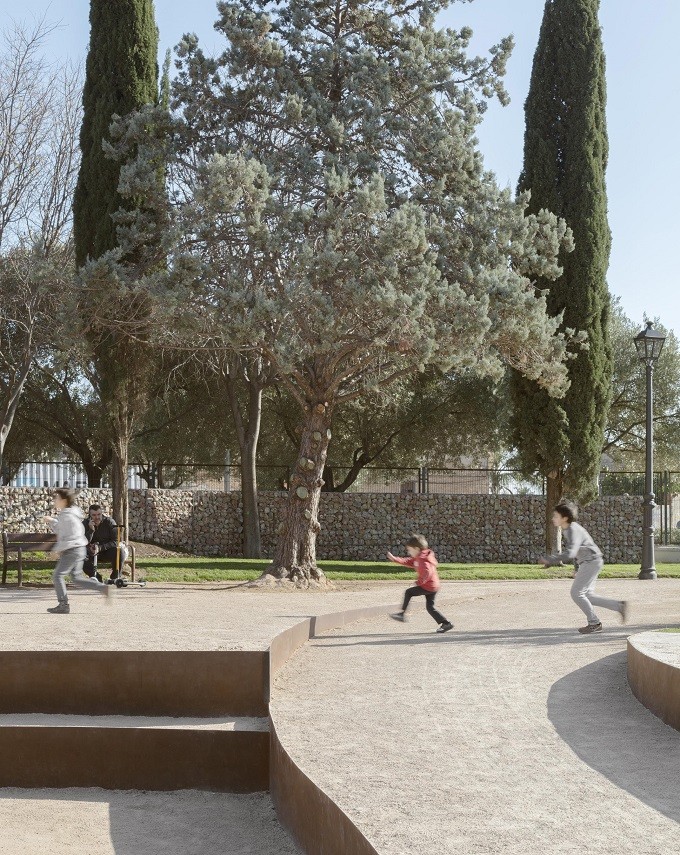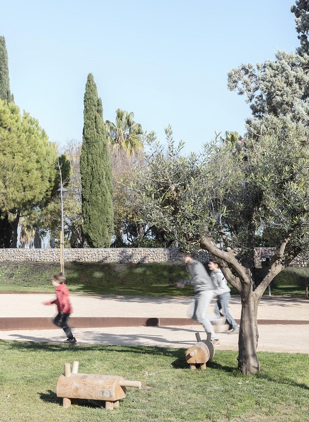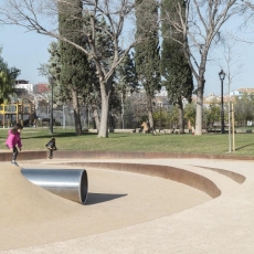 Paseando por el nuevo paisaje del parque, uno puede llegar a intuir diferentes personalidades, sin que ninguna de ellas esté encorchetada: el área de picnic junto a la entrada sur, que se llena de adultos y abuelos disfrutando del recreo de los más pequeños; una zona central de geometría ovalada con una composición de desniveles, que se convierte a su vez en gradería de descanso y en escenario de saltos, escaladas y batallitas; yendo hacia el norte, atravesando una zona verde junto al área de juegos en castillo, nos encontramos con una serie de espacios que construyen provocaciones al juego con superficies y texturas distintas…; en el lateral, por un desfase de las orgánicas líneas del trazo del proyecto, se sitúa el área para mascotas, entendida también como un rincón de estar.
