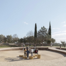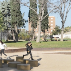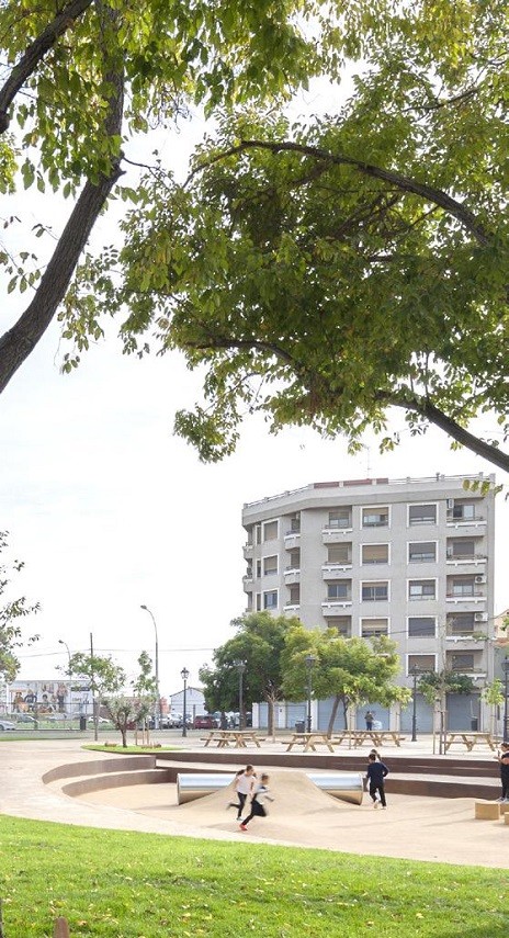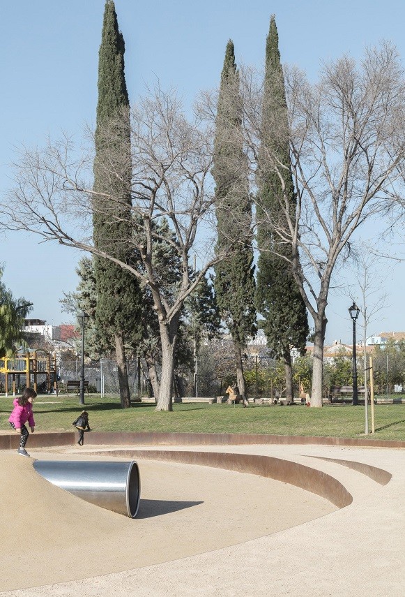 Como esa capa de reinterpretación que el mismo juego crea, el proyecto redibuja un trazado, y crea un recorrido que se expande y contrae, y que integra a su paso todos los espacios deseados. De hecho, el proyecto mantiene y reutiliza mediante su restauración todos aquellos elementos y superficies cuyo uso sigue siendo esencial para la ciudadanía, como el área verde y su arbolado, las mesas de picnic, el castillo multi juegos… incluso las maderas de techumbre de la antigua pérgola se emplean para uso de bancos y protección de alcorques en la zona canina”.