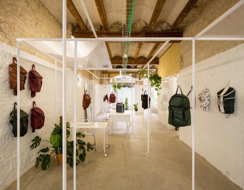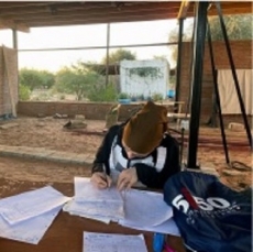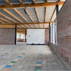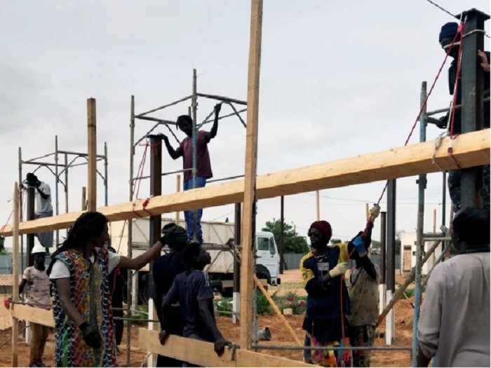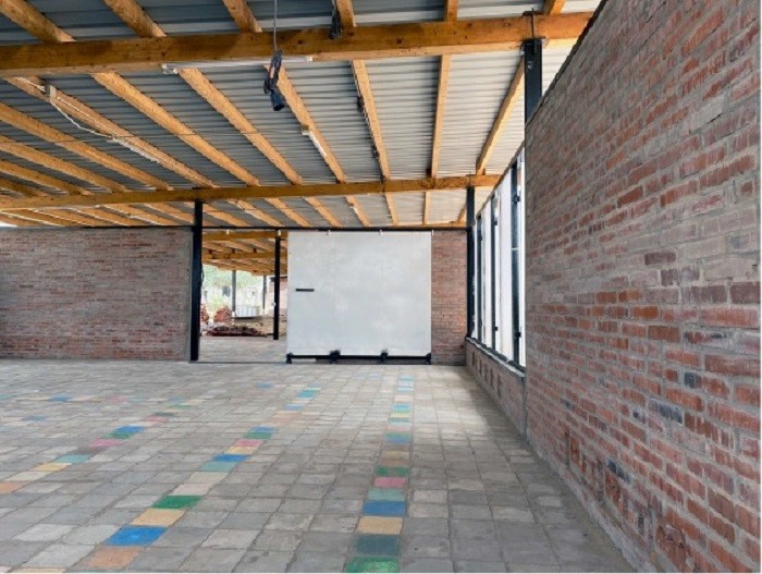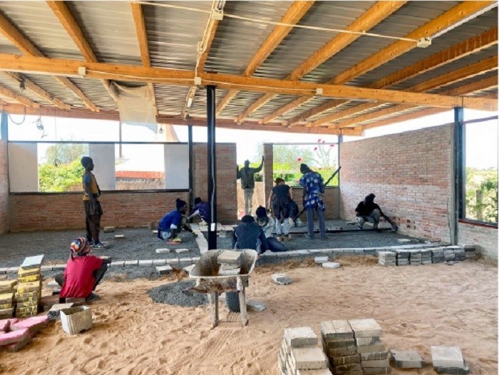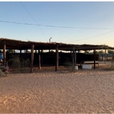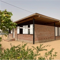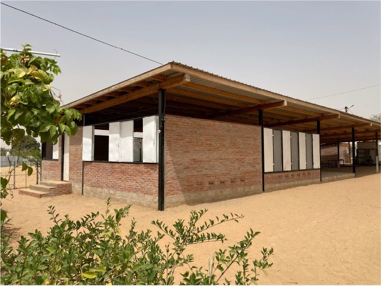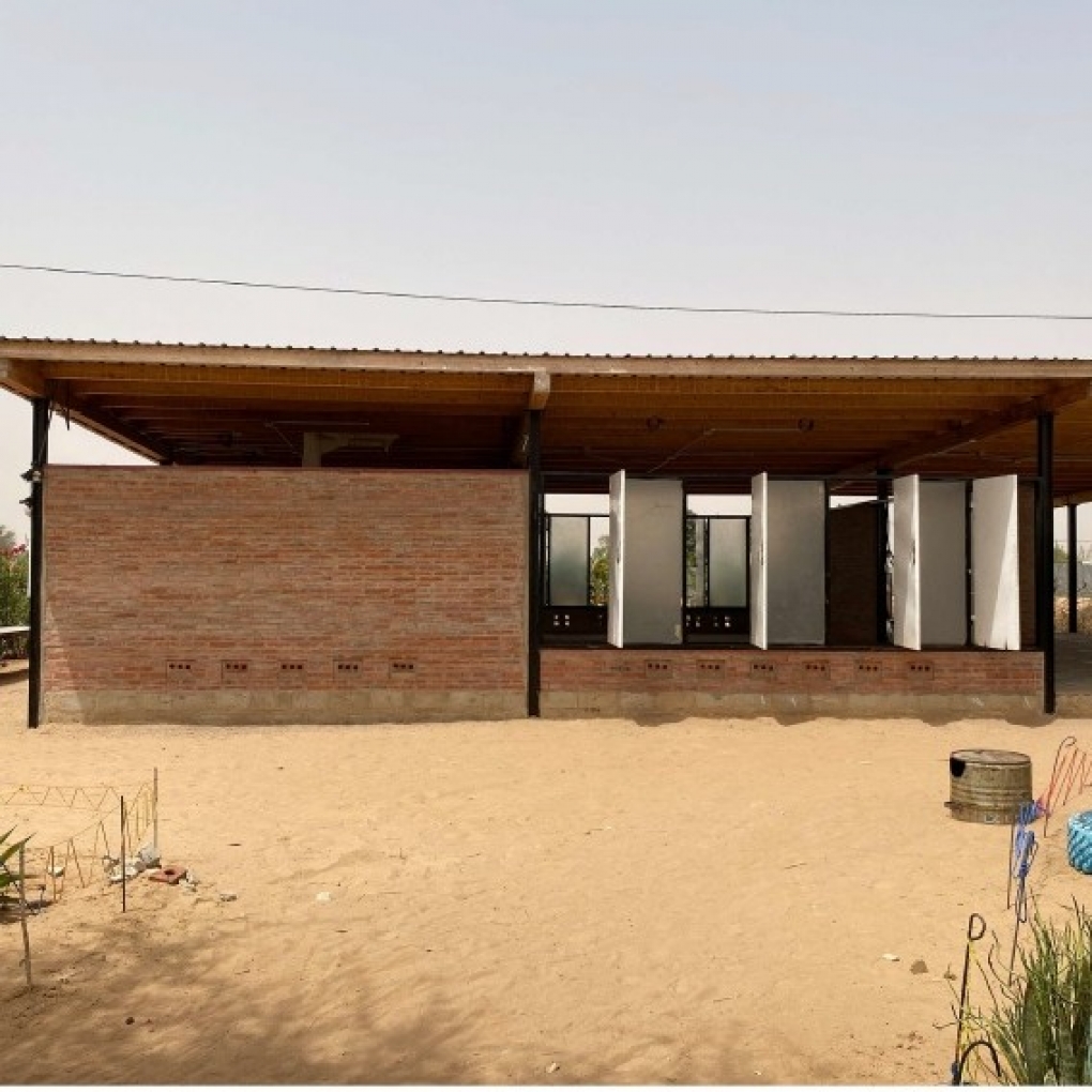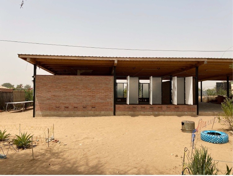 Este taller de 400m2 es un espacio digno para el trabajo artesano realizado por las mujeres. Les permite tener un espacio seco y protegido de la intemperie, con luz abundante, fresco y diáfano para el trabajo en equipo promoviendo así la comunicación existente entre ellas. Los diferentes espacios creados son tanto interiores como exteriores. En su totalidad, éstos albergarán un taller de costura, uno de cestería, uno de tintes y otro de bisutería y accesorios. El espacio interior se ha compartimentado mediante el mobiliario de almacenamiento. Dentro del mismo sistema modular se encuentran puertas fijadas entre los muebles. Esto permite en todo momento, dejar el espacio diáfano. Este espacio interior alberga un pequeño despacho para la administración, una parte para el almacén de materiales y la parte más grande está destinada al trabajo de costura, el cual, contiene 10 máquinas de coser y una mesa grande en el centro. El espacio exterior está compartimentado por el cambio de pavimento y lonas recicladas entre los pilaras. Existe una parte donde se mantiene la arena, dejando área confortable para las trabajadoras que trabajan sentadas en el suelo. Junto al taller se ha realizado un cuarto de luces para la instalación eléctrica. Contiene todo el equipo eléctrico que suministra la electricidad, procedente de las placas solares. El taller se abastece en su totalidad de energía renovable. Incluso las aguas pluviales son recogidas y almacenadas en bidones, de momento, únicamente para el consumo del ganado y la agricultura.